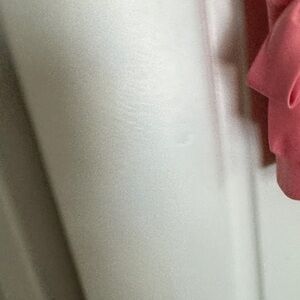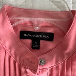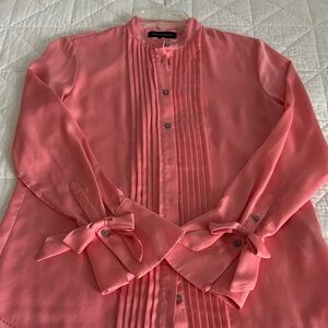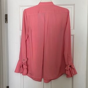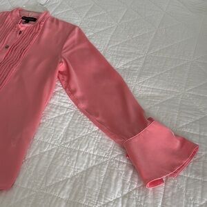 Stylish pink button-up blouse with pleated front. Perfect for any occasion. Pretty bell cuff with bow detail. Washes easily. Non-smoking home.