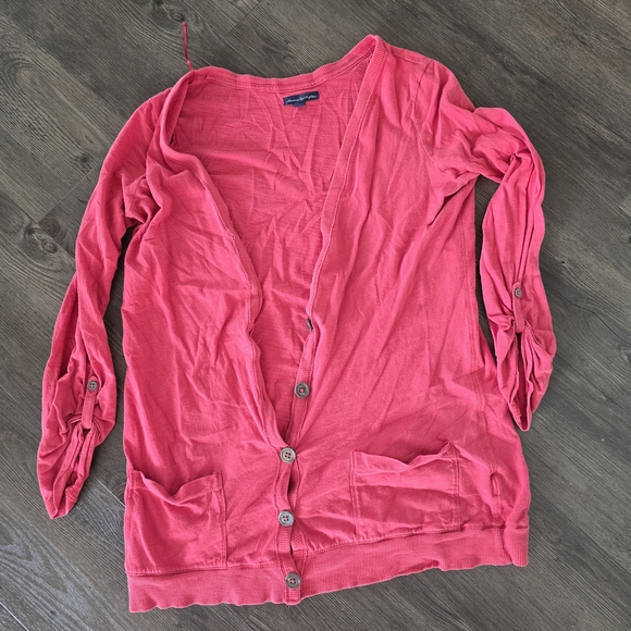 Stylish pink button-up cardigan with front pockets and ruched sleeves.