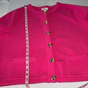 Stylish pink cardigan with gold buttons. Features front pockets and braided trim. VGUC, no stains, pilling or holes. Great with your Lilly! From smoke free home.