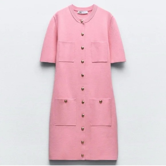 Elegant pink button-up dress with stylish front pockets. Perfect for any occasion.