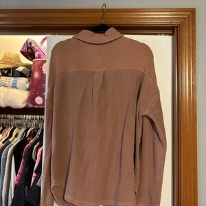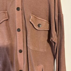 Stylish pink button-up jacket with front pockets. Perfect for layering.