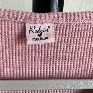 Stylish pink waffle ribbed top with faux/decorative button-up front. Short sleeves and V-neck design. 17 inches