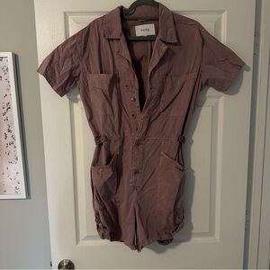 Stylish pink button-up romper with rolled sleeves and pockets. Perfect for casual outings.