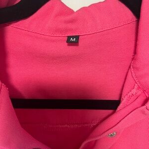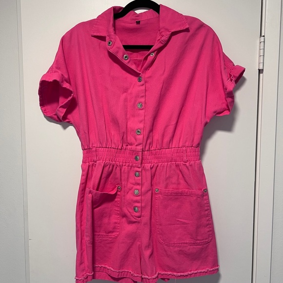 Stylish pink romper with button-up front and short sleeves. Features pockets for convenience.