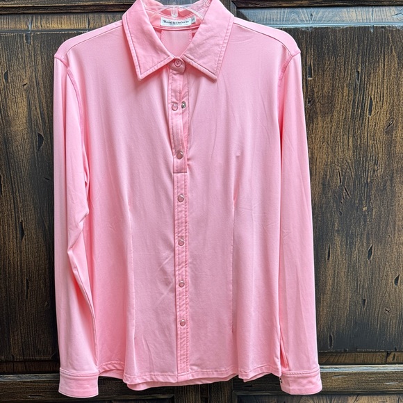 Stylish pink button-up shirt with a classic collar vented back for airflow. Perfect for casual rodeo occasions.