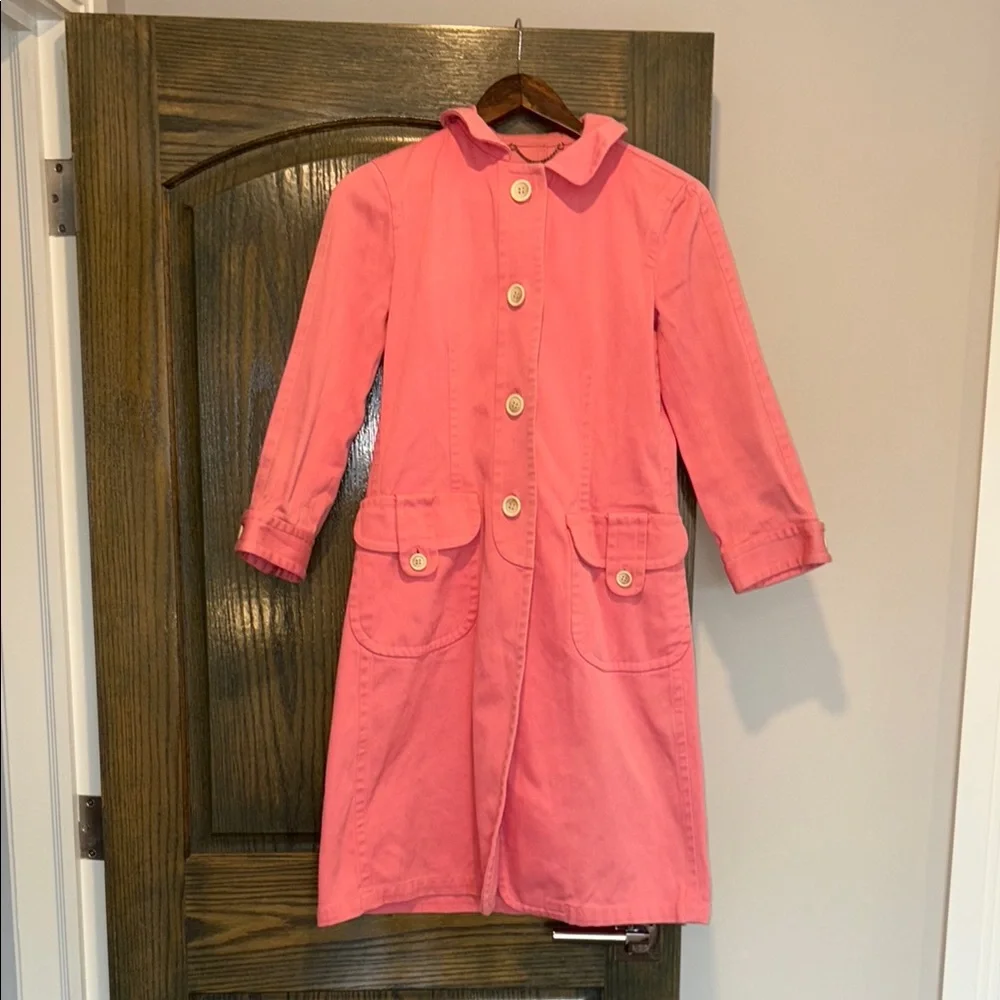 Stylish pink coat with large buttons. Features front pockets and a classic collar.