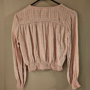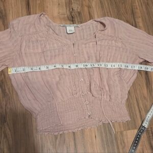 Elegant pink button-up top with a textured design. Perfect for casual outings and light enough for summer days. Pairs great with shorts!