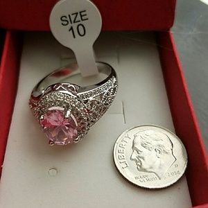 Size 10 beauty arrives in a red gift box. Looks sort of like a high school or college ring. Tag is off since picture was taken. 18kt white gold plated setting is highly decorative and reflective. I buy clothes with pink in them for an excuse to wear this one. Have not noticed any wear. Nice quality and giftable.