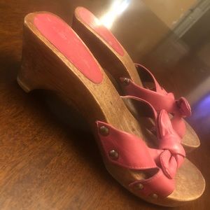2 1/2” Wooden Sole Wedge Pink Leather Bow Moderately Worn!