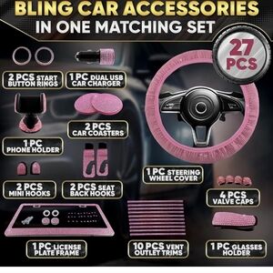 Pink Car Accessories Set, 27 Pieces – Bling Car Accessories for Interior Styling with Rhinestone Details for Daily Use, Universal Fit Kit for Steering Wheel, Vents, Mirror Area, Great Gift for Women.