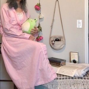 This is pleasant pink and white stripped robe. It is lightweight making it super comfortable to strut around in. There is an adorable C in cursive on the left side. It comes with a strap to tighten around the waist. My height is 5’1