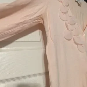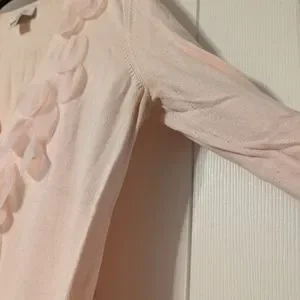 Pink cardigan sweater with flower petals along neckline. Slight pilling and wear under arm and slight pilling on front.