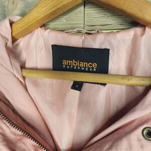 This item features: Light cargo jacket in blush pink with hood, drawstring waist, hand pockets with snap closure, zip chest pocket and full zip closure