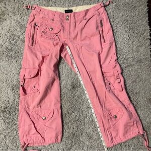 Stylish pink cargo pants with multiple pockets and drawstring details.