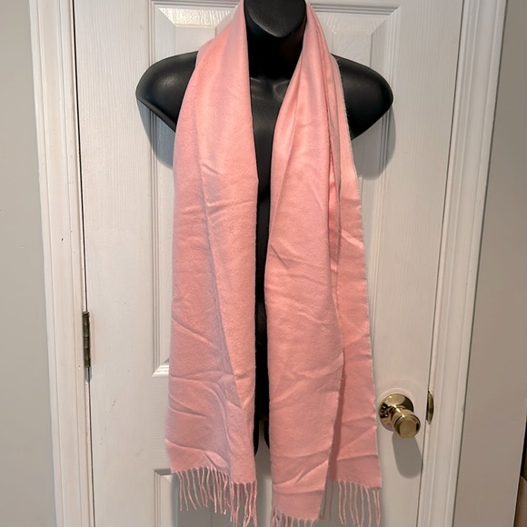 Gently Preowned Pink Cashmere Scarf made in England. Measures 62 inches long.
