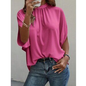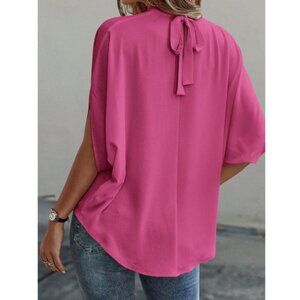 Pink Casual Top, Blouse Stand Collar Tie Back Half Sleeve