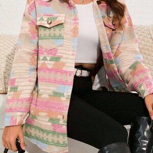 Pink Casual Womens Allover Print Drop Shoulder Flap Pocket Coat