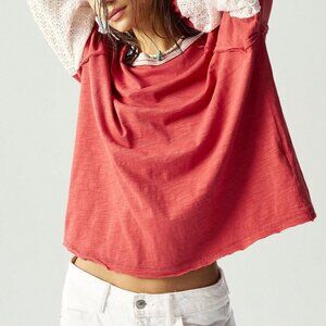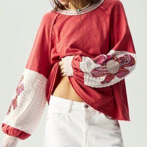 Pink Casual Women's Boho Knit Patchwork Lantern Sleeve Colorful Floral T-Shirt