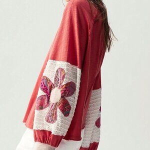 Pink Casual Women's Boho Knit Patchwork Lantern Sleeve Colorful Floral T-Shirt