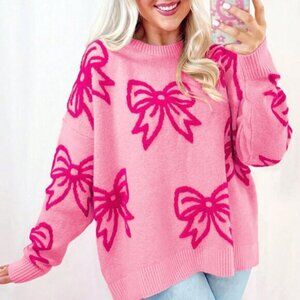 Pink Casual Women's Bow print Round Neck Long Sleeved Pullover Sweater