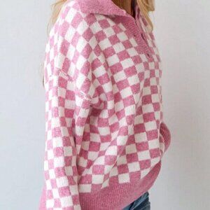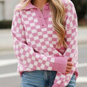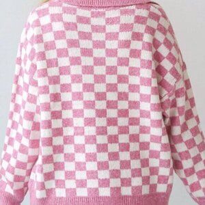 Pink Casual Women's Checkered Buttons Collar V Neck Drop Shoulder Sweater