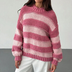 Pink Casual Women's Chunky Knit Contrast Color Lovely Crew Neck Warm Sweater