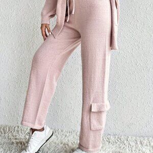 Pink Casual Womens Drop Shoulder Cardigan & Tie Front Knit Pants