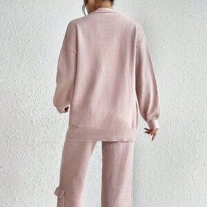 Pink Casual Womens Drop Shoulder Cardigan & Tie Front Knit Pants