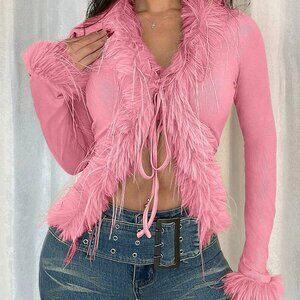 Pink Casual Women's Fringed V-Neck Knit Cardigan