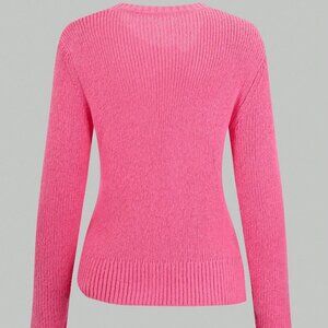 Pink Casual Women's Front Button Knit Top With Asymmetric Hem & Round Sweater