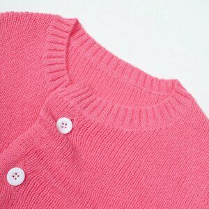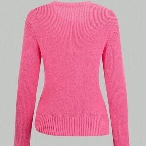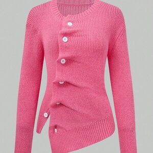 Pink Casual Women's Front Button Knit Top With Asymmetric Hem & Round Sweater
