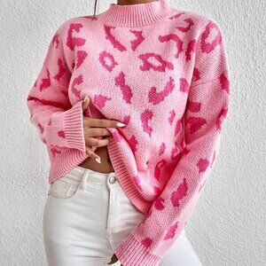 Pink Casual Womens Leopard Pattern Mock Neck Drop Shoulder Sweater