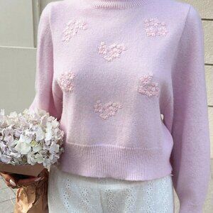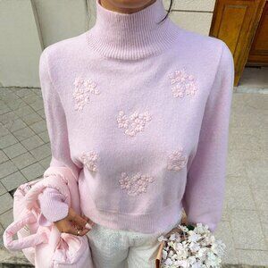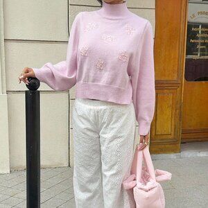 Pink Casual Women's Loose Versatile Embroidered Floral Sweater