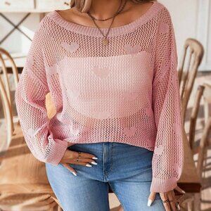 Pink Casual Women's Plus Size Hollow Out Sweater Pullover