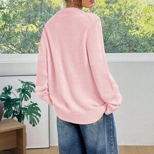 Pink Casual Women's Rib-Knit Long Sleeve Teddy Bear Embroidery Sweater