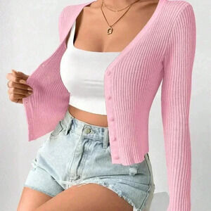 Pink Casual Women's Slim Solid Color Rib Knit Cardigan