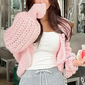 Pink Casual Women's Solid Color Cable Knit Oversized Open Front Cardigan Sweater
