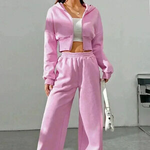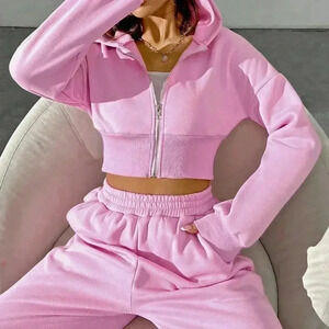 Pink Casual Women's Spring Zip Front Hooded Sweatshirt And Pants Set