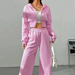 Pink Casual Women's Spring Zip Front Hooded Sweatshirt And Pants Two Piece Set