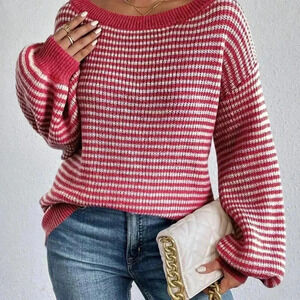 Pink Casual Women's Striped Printed Turtleneck Pullover Sweater