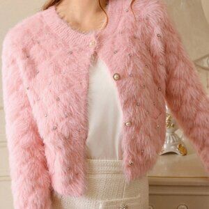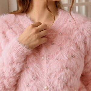 Pink Casual Women's Studded detailed fuzzy button down sweater Cardigan