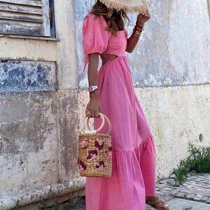 Pink Casual Women's Summer Holiday Solid Color Square Neck Puff Sleeve Dress