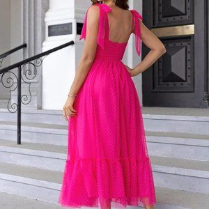 Pink Casual Womens Tie Shoulder Ruched Bust Ruffle Hem Mesh Overlay Cami Dress