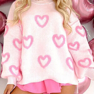 Pink Casual Women's Valentine's Day Heart Pattern Fuzzy Long Sleeve Sweater