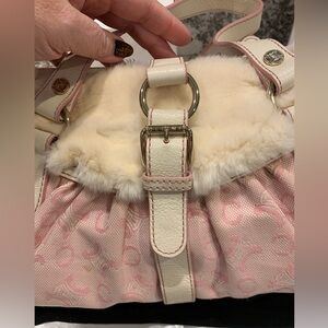 Pink Celine project bag with fur. Inside is beautiful. Outside is good with the exception of the bottom of the bag. Not sure what happened BUT if you have a cobbler you could have a piece of white leather on the bottom of the bag and it would be AMAZING.