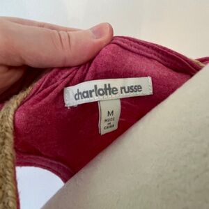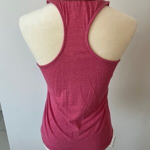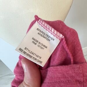Pink tank top with a rope like design around the neck area. There’s a little bit of black lace in the front as well as some chain detailing. Soft and lightweight. Size medium. Polyester rayon blend