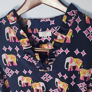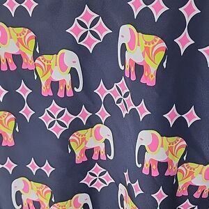 Super cute fun little ruffled neckline shift dress with pink and chartreuse elephants on a navy blue background.