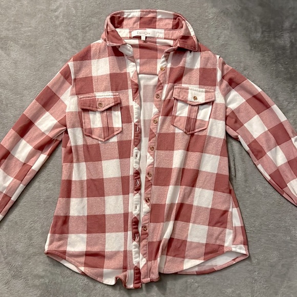 Pink & checkered button-up. Size: S women’s. Perfect for those cozy fall vibes 🍂 Barely worn, in great condition. Super soft fabric.