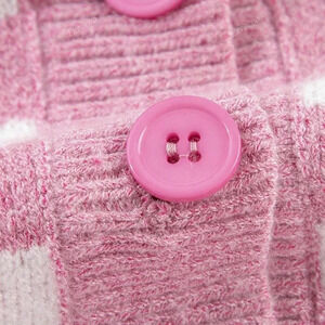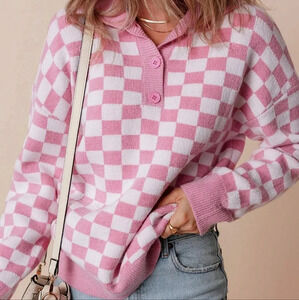 Pink Checkered Buttons Collar V Neck Drop Shoulder Sweater