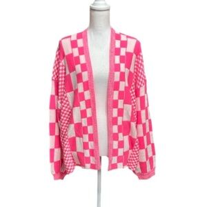Vibrant pink checkered sweater. Open front design. Cozy and stylish.